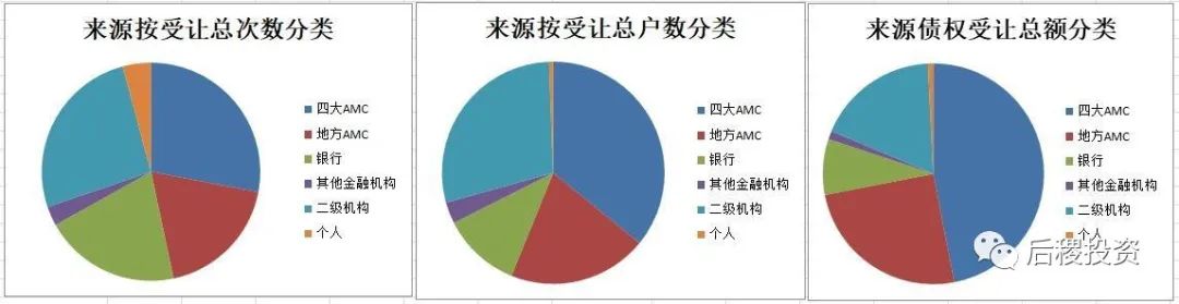 根據受讓來源分析,無論從受讓次數、戶數還是金額上看,四大全國AMC都是二級機構債權受讓的最主要來源,地方AMC和其他二級機構的比例則相當,而直接從銀行受讓債權也占了一小部分。四大AMC扎根行業較久,合作的二級機構較地方AMC更多屬正常現象,但同樣可以看出地方AMC和二級機構的快速發展。