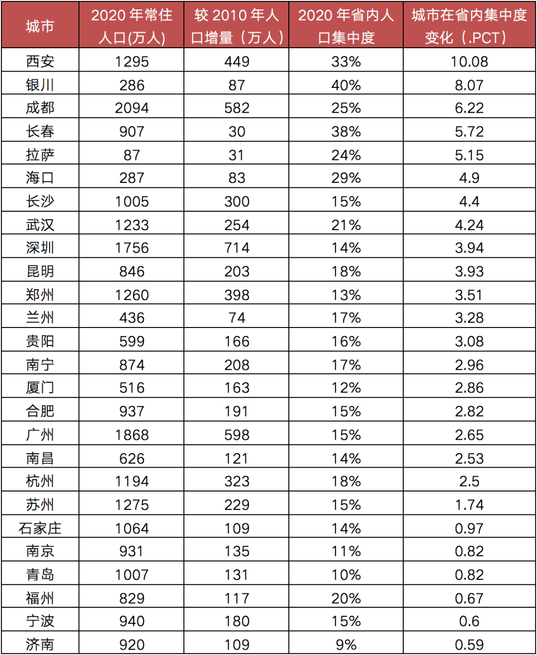 與此同時,省會/中心城市(以下簡稱“核心城市”)的人口虹吸效應進一步增強,人口集中度較十年前有不同程度的提升。