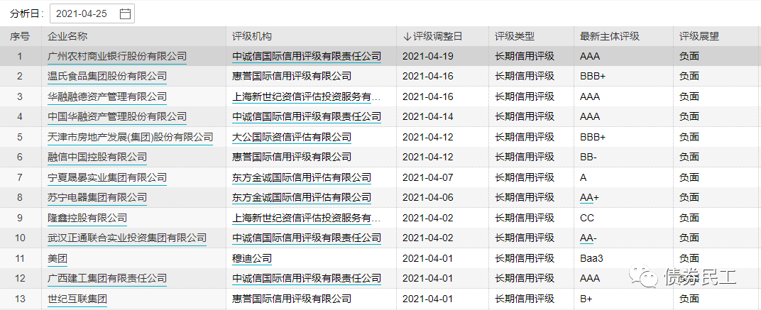 在萬億AAA農(nóng)商行評級展望被調(diào)整為負面!一文之后,債券民工在wind查詢了一下4月以來主體信用評級展望被調(diào)整為負面的債券發(fā)行人,還真的是有點多,一共有13家發(fā)行人被境外內(nèi)評級機構(gòu)將評級展望調(diào)整為負面,其中5家被境外評級機構(gòu)調(diào)整,8家被境內(nèi)評級機構(gòu)調(diào)整。
