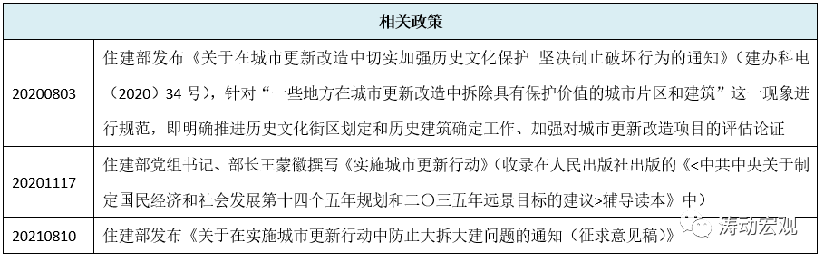 (一)盡管城市更新行動看似是中央定調并鼓勵,如2021年3月發布的十四五規劃提出“實施城市更新行動……加快推進城市更新,改造提升老舊小區、老舊廠區、老舊街區和城中村等存量片區功能,推進老舊樓宇改造,積極擴建新建停車場、充電樁”,但城市更新政策收緊還是能夠說明當前政策層面對目前城市更新現狀的不滿和憂慮。實際上針對城市更新過程中的亂象,早在2020年8月,住建部就已經發布34號文進行規范(主要針對破壞歷史文化現象)。