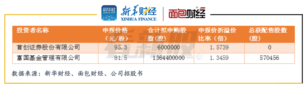 首創(chuàng)證券和富國基金2家投資機構報價大于等于81.5元/股,明顯較高。其中首創(chuàng)證券報出95.3元/股的價格,被直接歸為“無效高價”。高報價雖被剔除,但仍會對最終發(fā)行價產生一定影響。