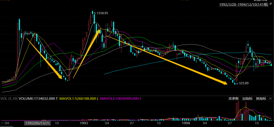 常在河邊走,哪有不濕鞋。上交所開業(yè)兩年后,中國(guó)資本市場(chǎng)就遭遇了自開市以來的最大熊市,上證指數(shù)僅僅歷時(shí)半年,就從最高1429點(diǎn)暴跌至最低386點(diǎn),跌幅逾70%。歷時(shí)三個(gè)月反彈至1558點(diǎn)后,又在一年半后跌至325點(diǎn),跌幅超77%。這期間,楊百萬也被套了。