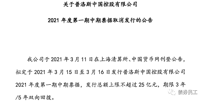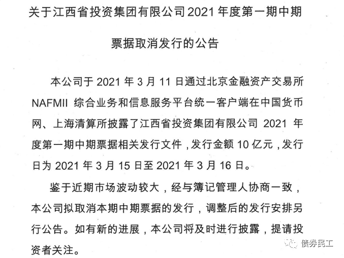 根據wind資訊3月17日的公告信息,多家AAA發行人公布了債券取消發行公告:重慶渝康資產經營管理有限公司 “21渝康資產MTN001”取消發行(15億元)、普洛斯中國控股有限公司“21普洛斯MTN001A”和“21普洛斯MTN001B”(25億元)取消發行、取消發行(10億元)、江西省投資集團有限公司“”取消發行(10億元),累計取消金額60億元。