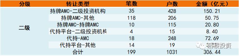 根據已有數據顯示,三級市場共出包約141億,二級投資機構出包占三級市場近74%,其他散戶占三級市場約26%。成交規模最大的為二級投資機構之間的出讓,成交金額占比在三級市場中占52.4%,二級投資機構之間的出包與收包為三級市場的主力軍。