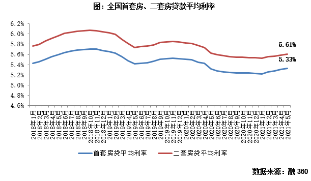 與此同時,全國房貸平均利率迎來“四連漲”。數據顯示,全國房貸平均利率于2021年2月止跌回升,連續四個月處在穩步上升通道,5月,全國首套房貸款平均利率5.33%,環比再上漲2BP,二套房貸款平均利率5.61%,環比上漲2BP。