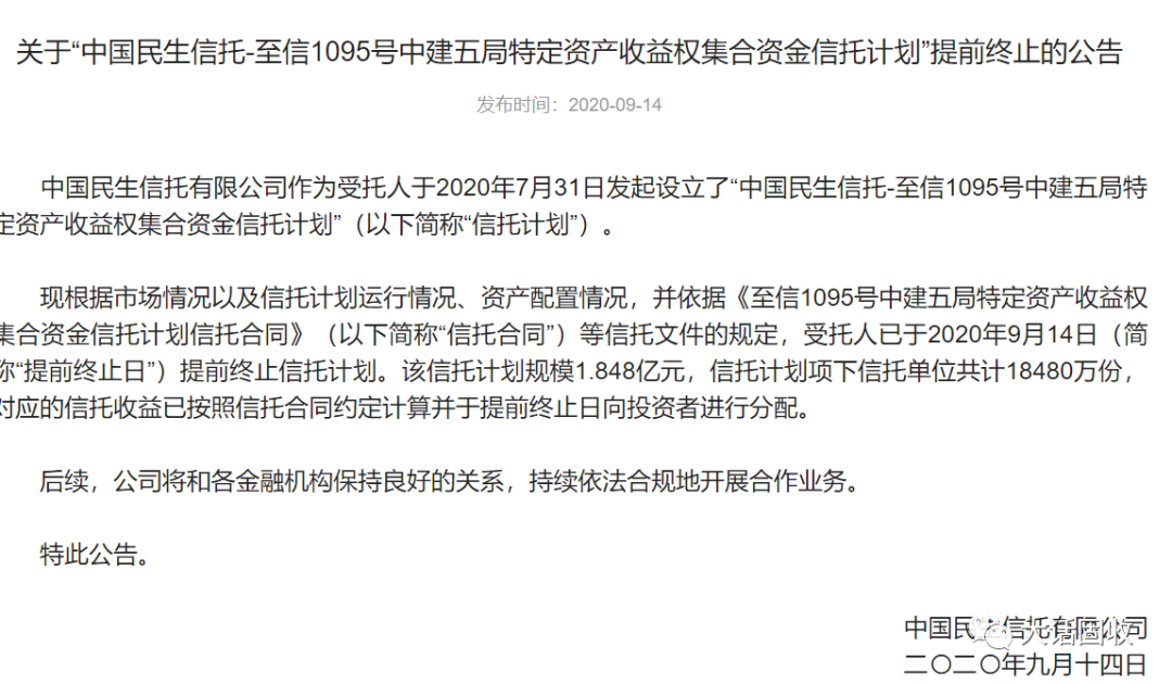 突然被CUE,民生信托也沒有慌,上周五鎮(zhèn)定公告項(xiàng)目提前結(jié)束,本周一就給了收益分配通知: