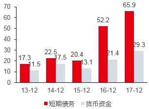 (1)、公司流動性壓力太大,債務無法滾動。從17年年報來看,公司的營業收入相比于16年大幅增加,歸母凈利潤小幅增長,不過公司于16年12月時將司爾特并表,16年只并了司爾特1個月的收入,但17年是并了司爾特全年的收入,所以用合并報表的收入減去司爾特的收入(17年為26億)可知,公司17年房地產板塊的收入比16年還減少了;當然這主要是公司預收減少所致,公司時點數的預收賬款從14年的92億,到15年時降到81億,到16和17年時,公司預收賬款只有60和69億了。