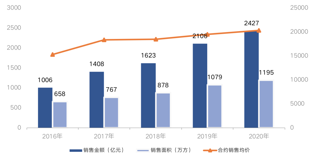 2020年金地集團(tuán)業(yè)績量價齊升,全年實現(xiàn)合約銷售金額2426.8億元,銷售面積1194.8萬平方米,分別同比增長15.2%和10.7%。
