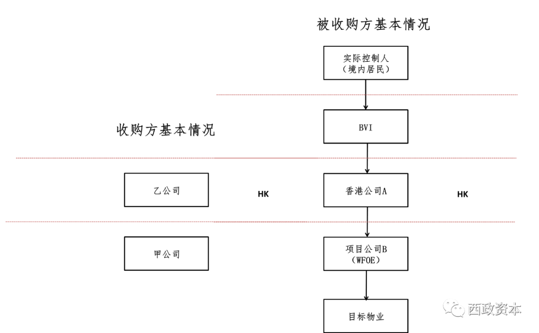 背景假設:甲公司(內資企業)擬實現對項目公司B(外商投資企業)名下資產控制之目的,甲公司有一香港關聯方乙公司。項目公司B為香港公司A的全資子公司,其最終實際控制人系境內居民。