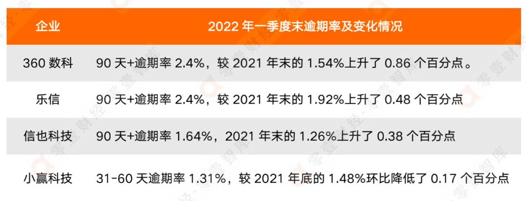 2021年四季度,360數科、樂信及信也科技三家平臺的90天+逾期率環比均有所抬頭,2022年一季度,這個勢頭在延續:一季度信也科技的90天+逾期率在三家平臺中最低,為1.64%,較2021年末的1.92%環比增加了0.38個百分點;樂信的90天+逾期率為2.4%,較2021年末的1.92%上升了0.48個百分點。360數科的90天+逾期率為2.4%,較2021年末的1.54%上升了0.86個百分點。