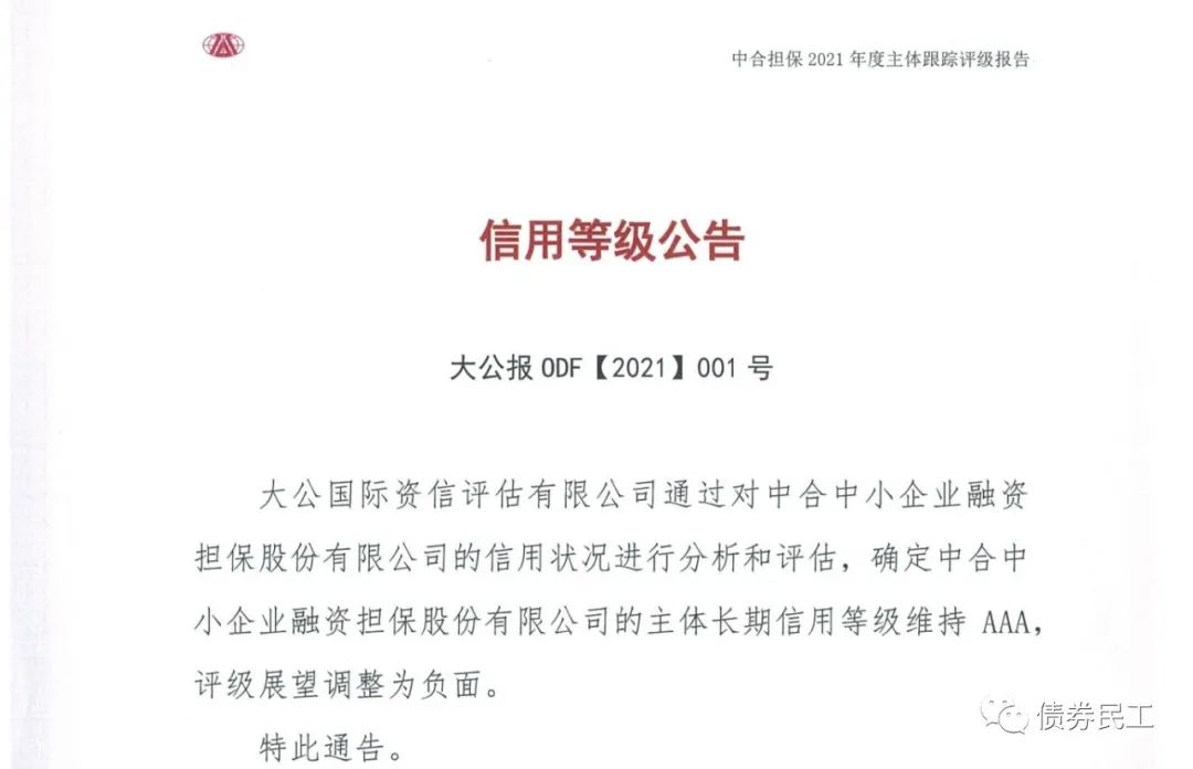 根據(jù)大公國際2021年6月21日披露的跟蹤評級報(bào)告,中合中小企業(yè)融資擔(dān)保股份有限公司(以下簡稱“中合擔(dān)保”)的主體信用評級維持AAA,評級展望為負(fù)面!
