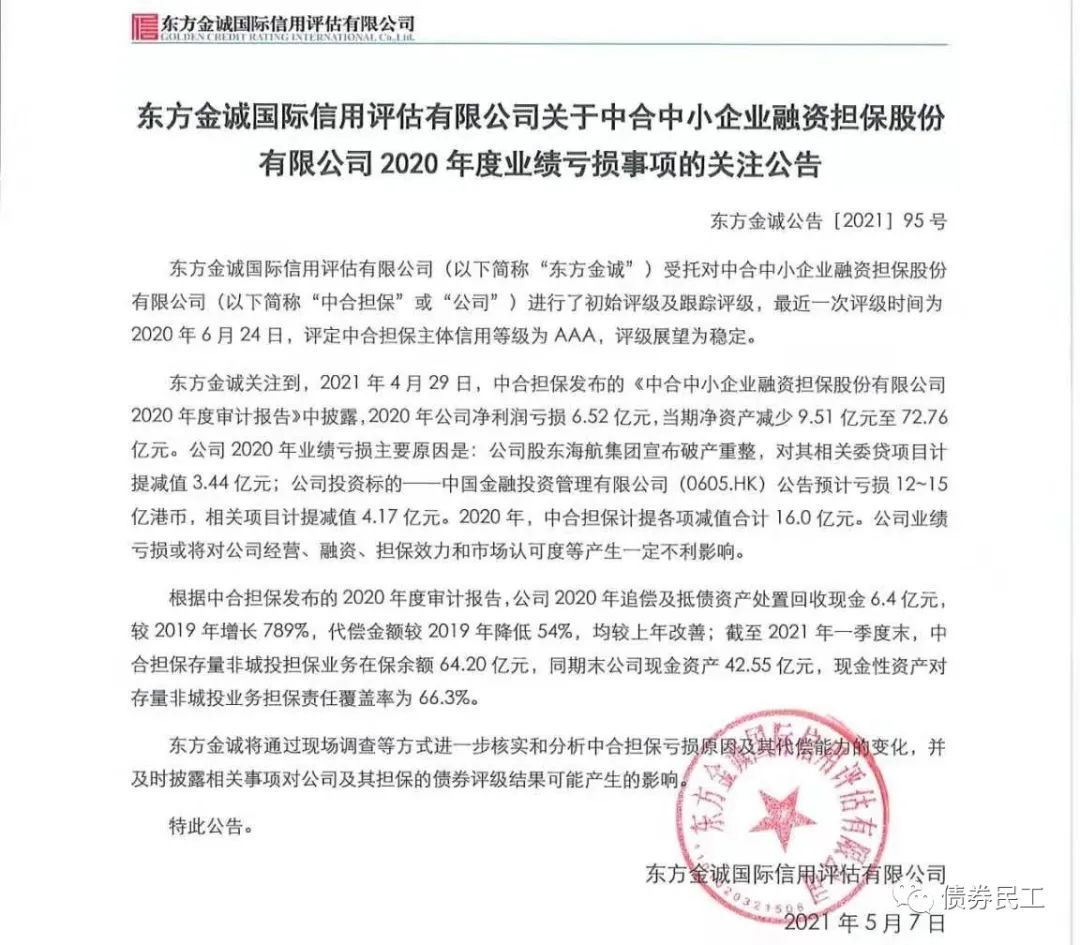 在此之前,中合擔(dān)保發(fā)行過15中合01和16中合01兩只公司債券,并獲得了大公國際和東方金誠的AAA主體信用評級。2021年5月7日,東方金誠國際信用評估有限公司出具了關(guān)注中合擔(dān)保2020年度業(yè)績虧損事項(xiàng)的關(guān)注公告,中合擔(dān)保2020年度凈利潤虧損6.52億元。目前東方金誠尚未出具對中合擔(dān)保的跟蹤信用評級報(bào)告。
