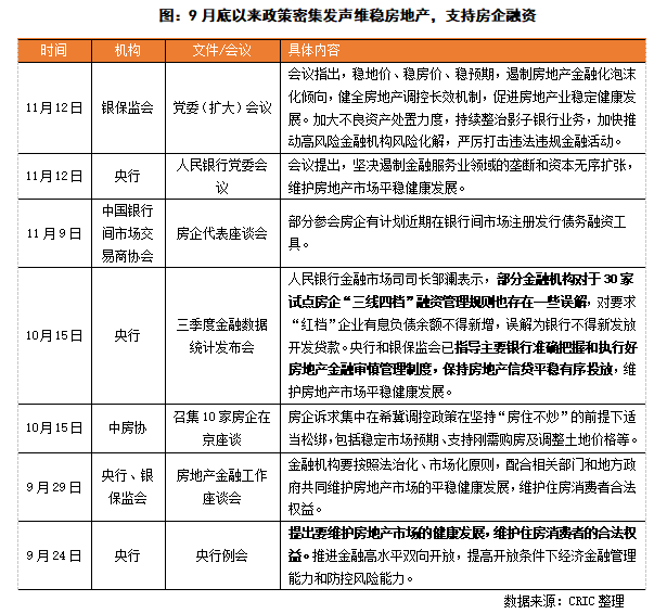 9月末央行首次提及“兩個維護”,指導銀行準確把握和執(zhí)行好房地產(chǎn)金融審慎管理制度,保持房地產(chǎn)信貸平穩(wěn)有序投放,維護房地產(chǎn)市場平穩(wěn)健康發(fā)展。10月15日,中房協(xié)召集了10家房企在京座談,住建部相關部門人員參與主持,據(jù)透露,房企的主要訴求集中在希冀調(diào)控政策在堅持“房住不炒”的前提下適當松綁,包括穩(wěn)定市場預期、支持剛需購房及調(diào)整土地價格等。此后,央行和銀保監(jiān)會又多次提及促進房地產(chǎn)行業(yè)穩(wěn)定健康發(fā)展。在此情況下,政策端風向有所緩和,從宏觀上對房地產(chǎn)信心重塑有所推進,維穩(wěn)房地產(chǎn)。