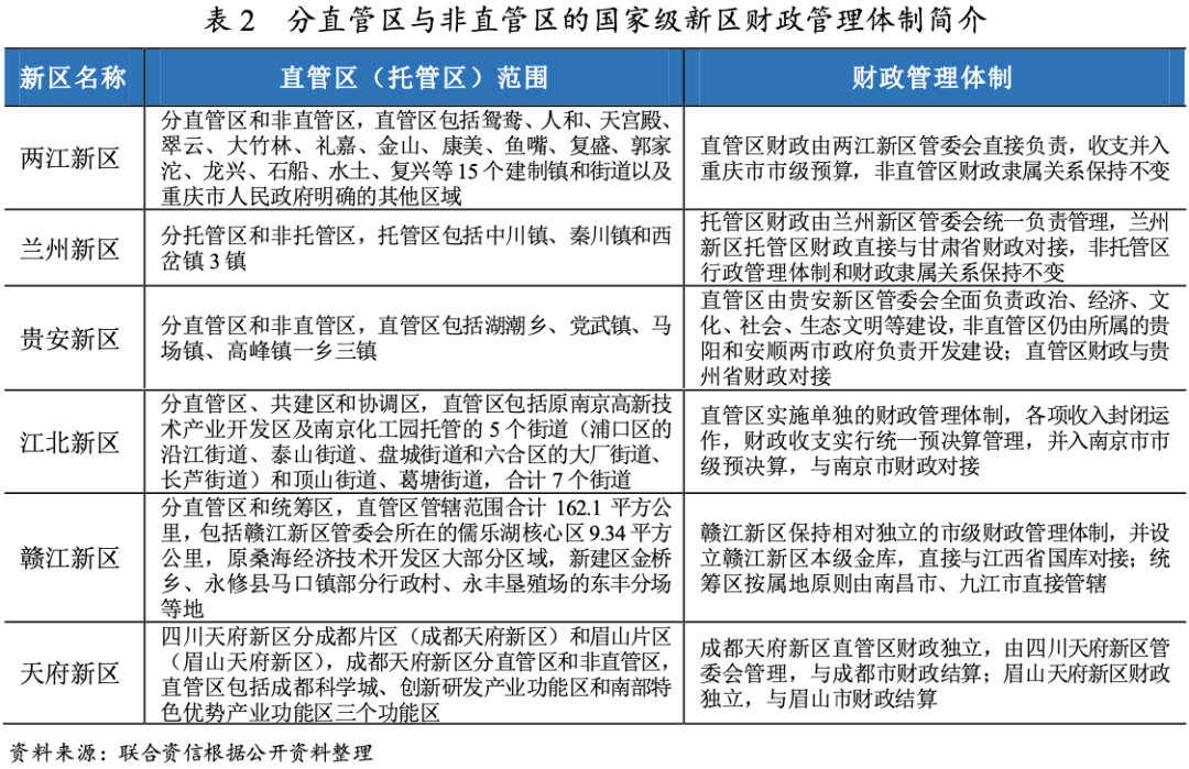 政府型新區與政區合一型新區與正常行政區財政管理體制一致,均具備獨立財政并對接上級政府金庫直接與上級政府進行結算,財政獨立性、靈活性強。管委會型新區財政管理體制差異較大:(1)部分新區分直管區和非直管區,通常直管區是新區發展的起步區或重點區域,直管區具備獨立財政,非直管區保持原有的財政隸屬關系不變,此種情況下,新區財力更多反映的是直管區范圍內產生的財政收入。