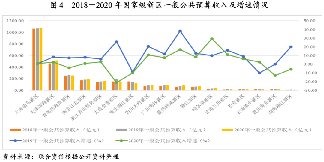 從增長情況來看,2020年受疫情及減稅降費政策等因素影響,國家級新區一般公共預算收入增速普遍下降,金普新區、貴安新區、兩江新區等一般公共預算收入降幅明顯。