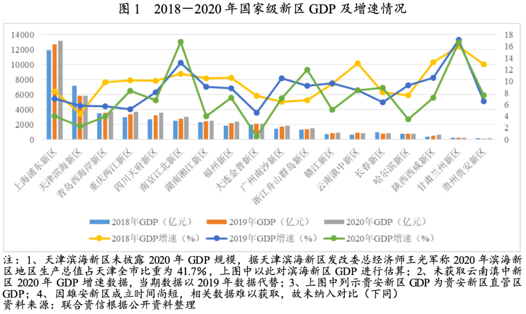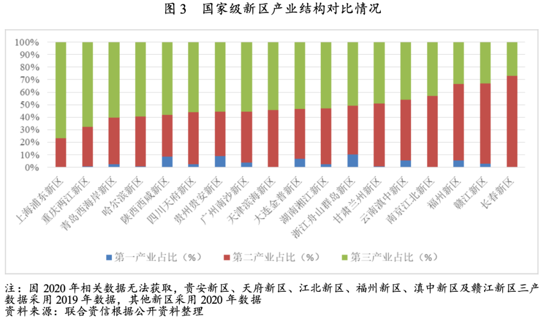 受成立時間、空間布局、資源稟賦、區位條件、產業基礎、發展規劃、支持政策等因素綜合影響,國家級新區經濟發展水平不一,浦東新區經濟發展一枝獨秀,濱海新區經濟縮水嚴重,貴安新區、蘭州新區及西咸新區等西部新區經濟發展較為滯后。國家級新區經濟活力較大,增速普遍高于所在城市,且對所在城市經濟發展的貢獻普遍較大。各新區產業結構受新區定位、產業基礎、產業規劃及布局等影響呈明顯分化態勢。