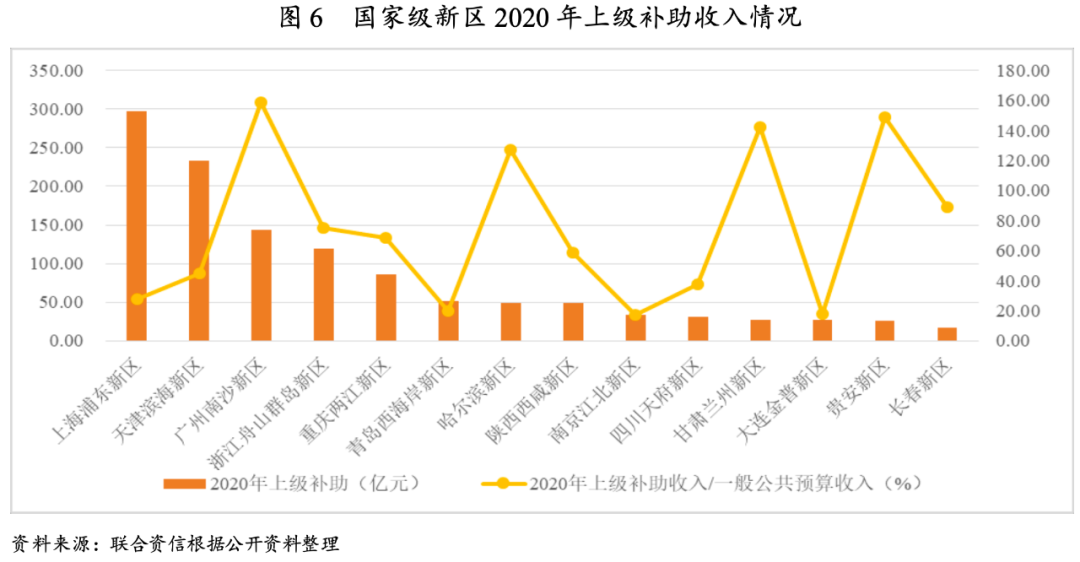 因成立時間、定位及財政結算體制等不同,國家級新區具體獲得的支持存在較大差異。南沙新區、貴安新區、蘭州新區及哈爾濱新區等上級補助收入對新區綜合財力貢獻大。