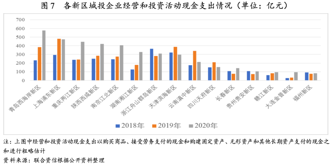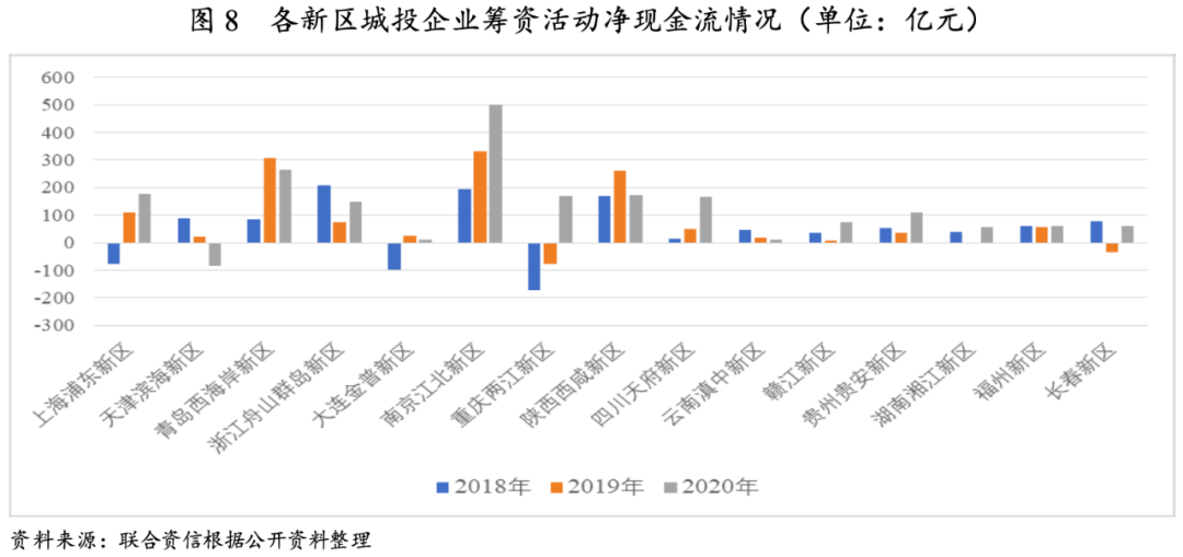 國家級新區整體存在較大融資需求,各新區城投企業投資需求不同且資金投向有所分化。伴隨著新區開發建設的逐步推進,絕大多數新區城投企業籌資活動呈凈流入狀態。