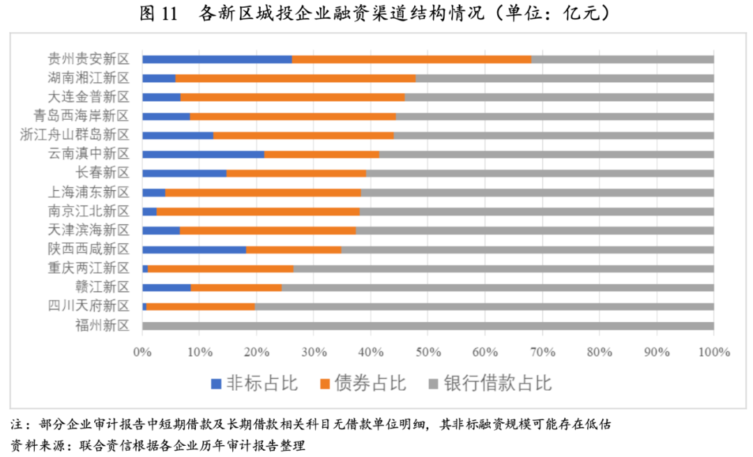 國家級新區城投企業融資渠道結構差異較大,部分新區城投企業融資渠道結構有所失衡,非標及債券市場融資占比較高。