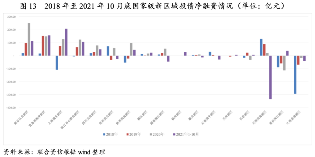 從凈融資規模來看,國家級新區城投債凈融資情況分化明顯,2018年至2021年10月底,金普新區、兩江新區、濱海新區和長春新區城投債凈融資為負。其中,兩江新區2020年以來城投債集中到期、償還量較大導致報告期間城投債累計凈融資為負;金普新區、濱海新區和長春新區則更多受區域融資環境拖累。同期,其他新區城投債融資均呈凈流入狀態,江北新區和西海岸新區城投債凈融資規模均超過450億元,明顯領先于其他新區;滇中新區及蘭州新區城投債凈融資規模較小。