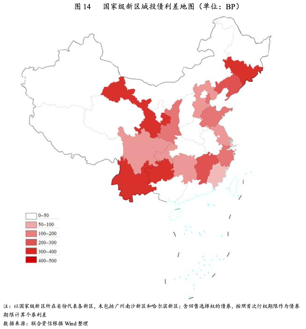 不同新區城投企業債券發行利差分化明顯,浦東新區、福州新區、雄安新區等新區城投債發行利差較低,貴安新區、滇中新區、長春新區、蘭州新區等城投債發行利差較高。