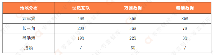 具體來看世紀互聯在京津冀地區的數據中心規模最大,在長三角和粵港澳的規模差距不大;萬國數據在京津冀、長三角和粵港澳三大區域的資源布局相對均衡,除此之外,還在成渝地區進行了布局;秦淮數據的數據中心布局則較為集中,其中85%的資源分布在京津冀地區。