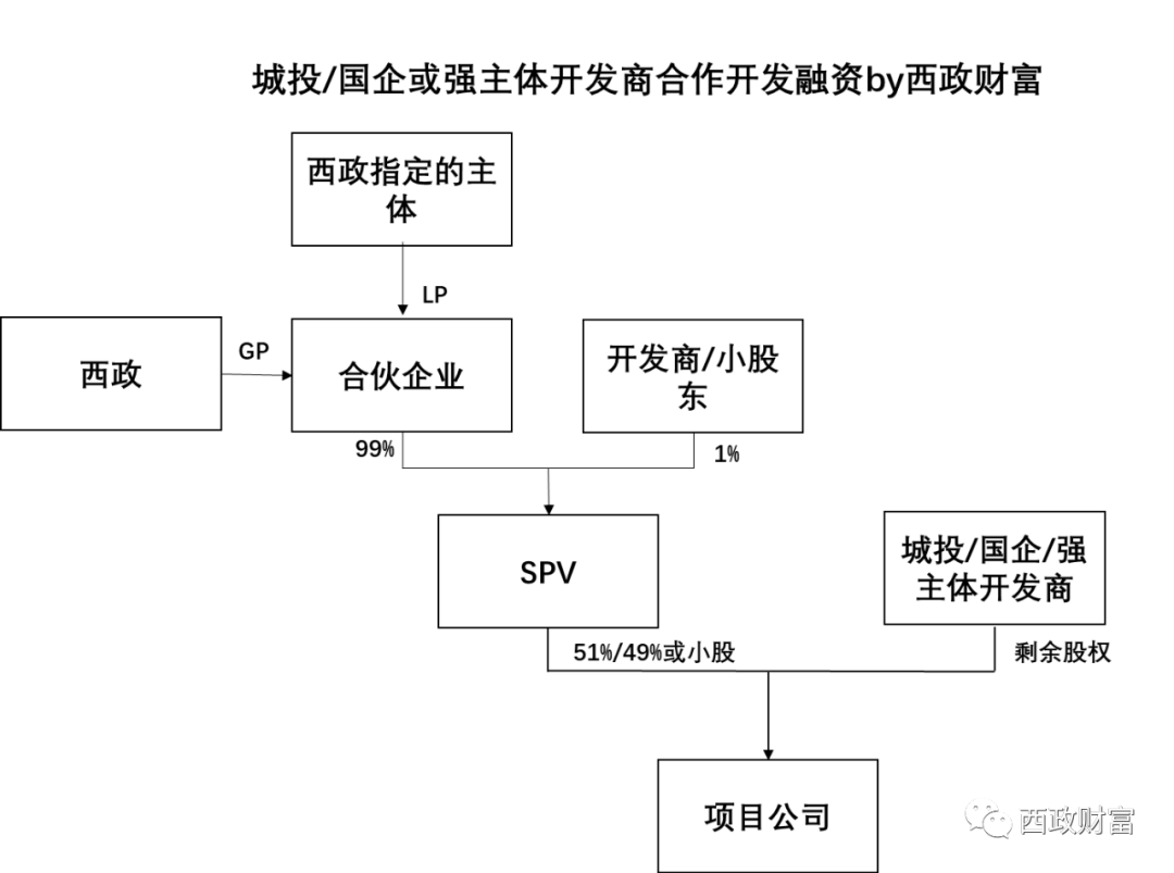 (1)西政(GP)與其指定的主體(LP)共同成立合伙企業(yè),并取得SPV99%的股權(quán),通過SPV實(shí)現(xiàn)對(duì)項(xiàng)目公司的投資。