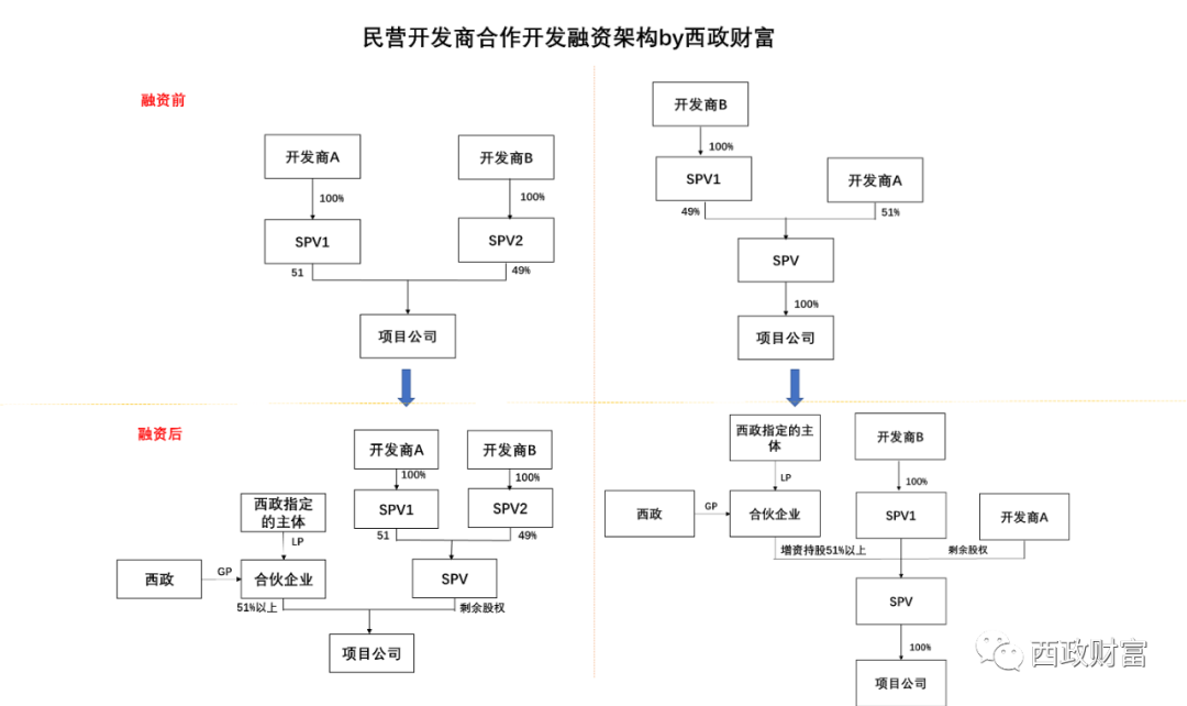 (1)西政(GP)與其指定的主體(LP)成立合伙企業(yè),合伙企業(yè)取得項(xiàng)目公司51%以上的股權(quán)(左圖),或合伙企業(yè)通過增資方式持有SPV51%以上的股權(quán)(右圖),合伙企業(yè)與開發(fā)商約定對(duì)賭回購(gòu)條件。