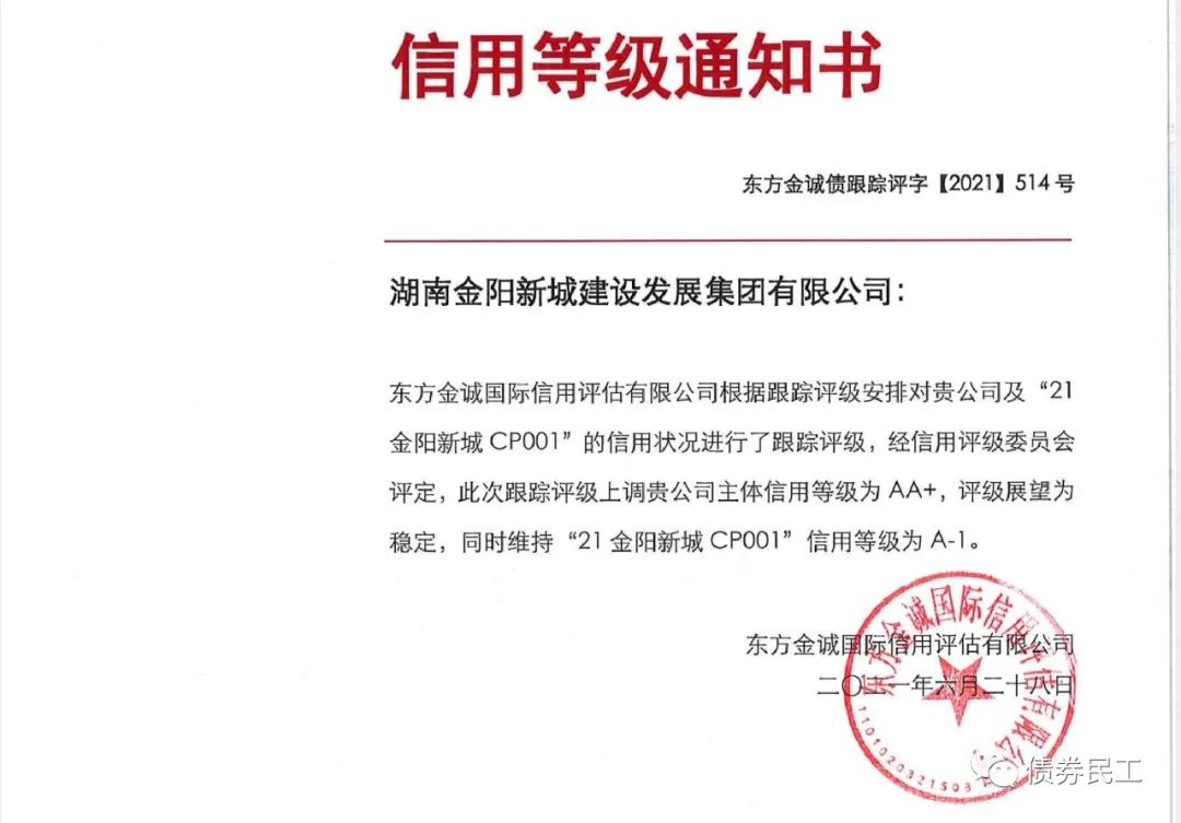 根據(jù)東方金誠(chéng)2021年6月28日出具的跟蹤評(píng)級(jí)報(bào)告,湖南金陽(yáng)新城建設(shè)發(fā)展集團(tuán)有限公司(以下簡(jiǎn)稱“湖南新城建發(fā)”)的主體信用評(píng)級(jí)上調(diào)至AA+。本次評(píng)級(jí)上調(diào)的原因可能包括:長(zhǎng)沙市和瀏陽(yáng)市經(jīng)濟(jì)實(shí)力很強(qiáng)、瀏陽(yáng)恒康等國(guó)有資產(chǎn)劃入、在資產(chǎn)注入和政府補(bǔ)貼方面得到實(shí)際控制人的支持等。