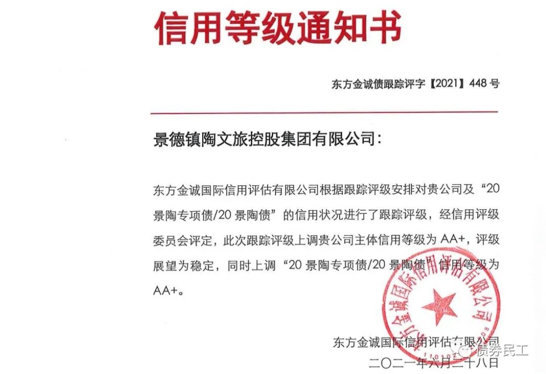 根據(jù)東方金誠(chéng)2021年6月28日出具的跟蹤評(píng)級(jí)報(bào)告,景德鎮(zhèn)陶文旅控股集團(tuán)有限公司(以下簡(jiǎn)稱“景德鎮(zhèn)陶文旅”)的主體信用評(píng)級(jí)上調(diào)至AA+。本次評(píng)級(jí)上調(diào)的原因可能包括:景德鎮(zhèn)經(jīng)濟(jì)實(shí)力很強(qiáng)、主營(yíng)業(yè)務(wù)區(qū)域?qū)I(yíng)性很強(qiáng)、股東資產(chǎn)劃撥等。
