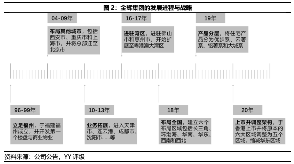 金輝集團(tuán)的跨區(qū)域戰(zhàn)略布局緩慢,自96年于福州成立后至16年進(jìn)駐緊鄰的灣區(qū)花了20年,其中或有02年與融僑合作致使金輝自有品牌布局較慢所致,但對(duì)于核心城市的全國(guó)化布局仍稍顯緩慢。與其他房企自一線城市串聯(lián)至二三線城市的模式不同,金輝集團(tuán)早期布局上海并遷總部于北京后,其發(fā)展區(qū)域圍繞著西北、西南和東北區(qū)域,而非自一線有序下沉至二三線,此一節(jié)奏或?yàn)閷?dǎo)致金輝集團(tuán)的發(fā)展滯后于其他知名房企的主因。