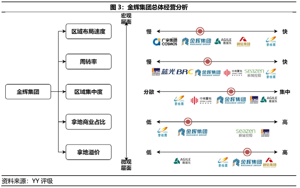 金輝集團(tuán)的經(jīng)營(yíng)指標(biāo)包括周轉(zhuǎn)率/區(qū)域集中度/綜合拿地占比表現(xiàn)均較為中庸(如圖3),但高價(jià)/溢價(jià)拿地情形較為普遍,疊加不具備投資性物業(yè)運(yùn)營(yíng)優(yōu)勢(shì),短期或面臨利潤(rùn)遭壓縮的壓力,中長(zhǎng)期亦面臨成本端上升造成的利潤(rùn)擠壓。