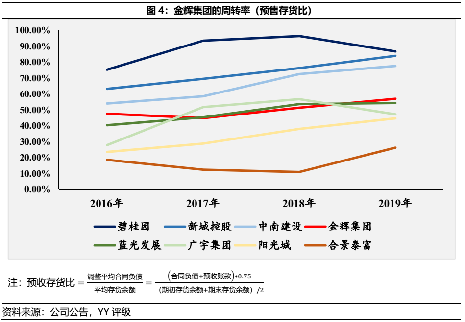 金輝集團(tuán)在經(jīng)營(yíng)層面周轉(zhuǎn)率指標(biāo)表現(xiàn)中庸,雖無(wú)法企及碧桂園的周轉(zhuǎn)率,但仍在行業(yè)標(biāo)準(zhǔn)水平。
