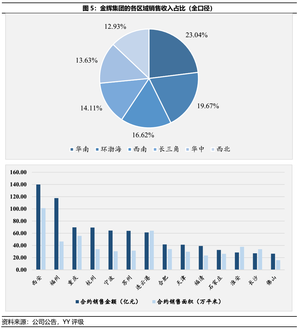區(qū)域收入層面來(lái)看,或由于金輝集團(tuán)起家于福建所致,華南區(qū)域占比較高,占23.04%。但作為閩系房企,金輝集團(tuán)并沒(méi)有呈現(xiàn)如大多民營(yíng)房企般的區(qū)域集中問(wèn)題,金輝的區(qū)域性布局整體較為分散。此外,受到金輝集團(tuán)全國(guó)化布局,并著眼于土地價(jià)格水平較低城市進(jìn)行布局所致,西安區(qū)域貢獻(xiàn)收入為集團(tuán)首位,高于大本營(yíng)福州區(qū)域。