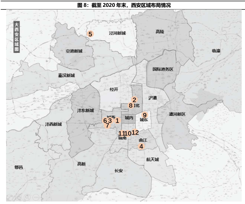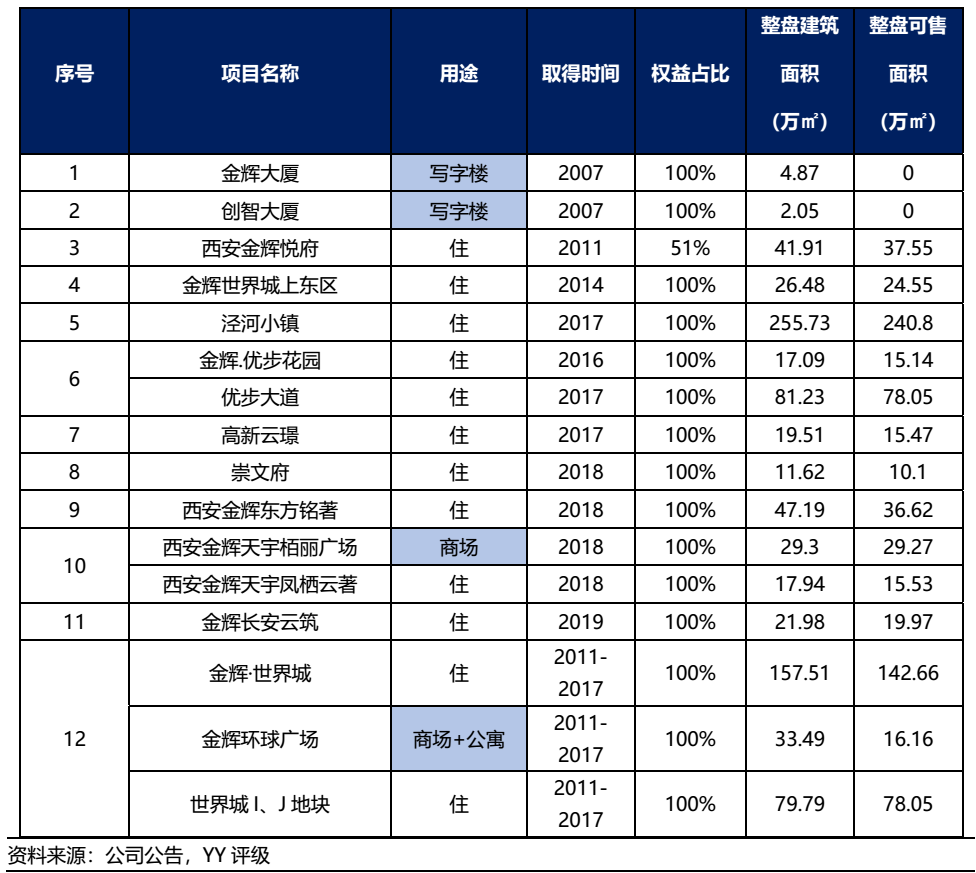 除了西安市場(chǎng)于17年之前存在價(jià)格洼地外,金輝集團(tuán)之所以大規(guī)模布局于西安,或基于金輝嘗試?yán)毛@取綜合用地降低土地成本,而于西安大規(guī)模布局。目前,金輝集團(tuán)位于西安的12個(gè)存量項(xiàng)目存在較大體量的綜合商業(yè)自持,除了涇河小鎮(zhèn)或面臨去化壓力外,其余項(xiàng)目的區(qū)位較為核心。