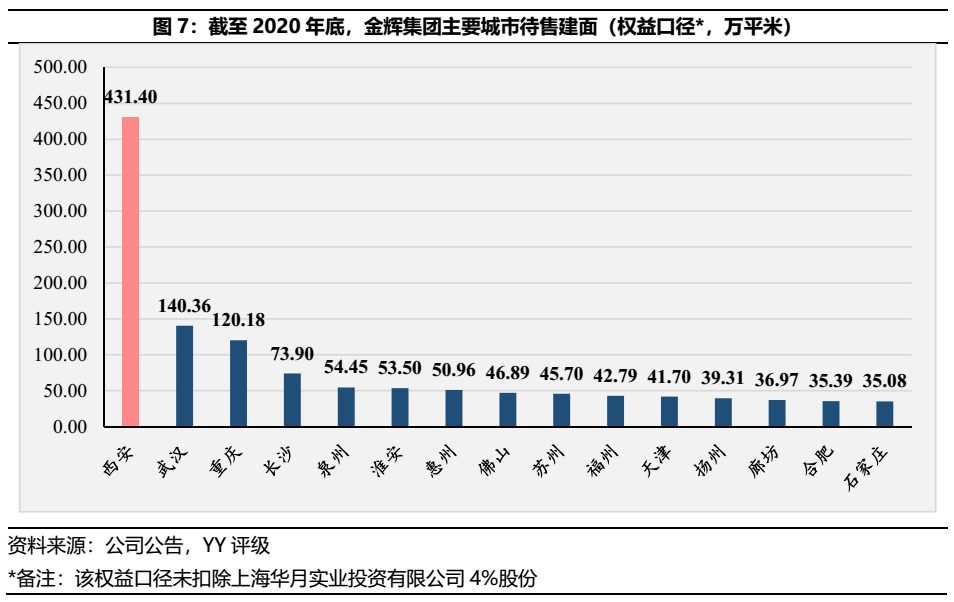 自各城市待售建面(權(quán)益口徑)統(tǒng)計(jì)可見(jiàn),除了西安區(qū)域待售建面遠(yuǎn)超于各城市,其余城市的待售建面較為平均。金輝集團(tuán)的重倉(cāng)西安策略或與集團(tuán)為了解決土地成本問(wèn)題有關(guān),除了一般的住宅和公寓產(chǎn)品外,金輝集團(tuán)的西安區(qū)域業(yè)態(tài)亦存在較多的持有型物業(yè),致使截至20年末待銷(xiāo)售建面達(dá)431.40萬(wàn)平米,約等于20多個(gè)中型樓盤(pán)。