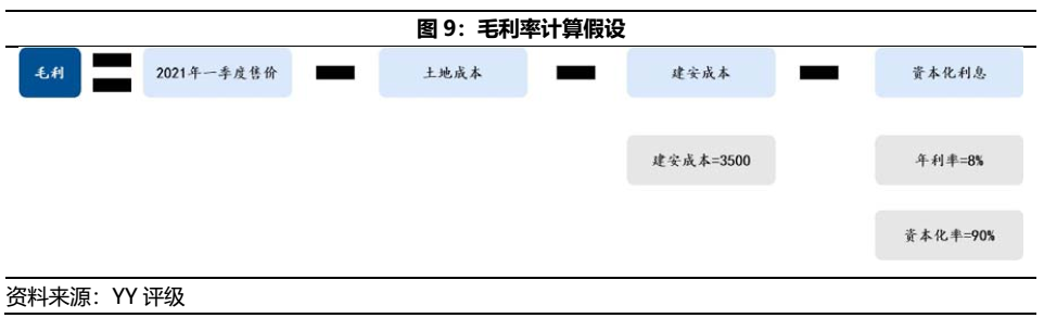 利用簡(jiǎn)要的毛利率測(cè)算(如圖9),結(jié)合2021年一季度項(xiàng)目/競(jìng)品售價(jià)、土地獲取成本、建安成本(含銷(xiāo)管成本)和資本化利息等要素,對(duì)金輝集團(tuán)存量?jī)?chǔ)備項(xiàng)目中的近5年間獲取項(xiàng)目進(jìn)行毛利率估算。