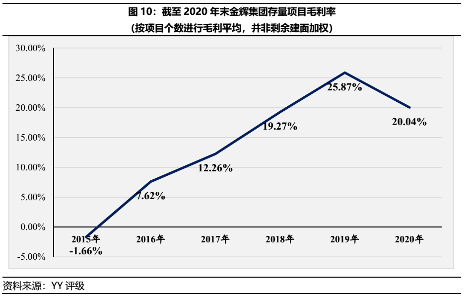 根據(jù)圖9對(duì)金輝集團(tuán)截至20年末存量項(xiàng)目進(jìn)行毛利率測(cè)算,并依照拿地時(shí)間進(jìn)行排序,可發(fā)現(xiàn)自15至17年間存量項(xiàng)目毛利率僅為-1.66%、7.62%和12.26%,屬于第一波利潤(rùn)壓縮期間,該問(wèn)題始于金輝集團(tuán)自身高溢價(jià)拿地造成。而20年新獲取的項(xiàng)目則為20.04%,將面臨第二波利潤(rùn)壓縮。
