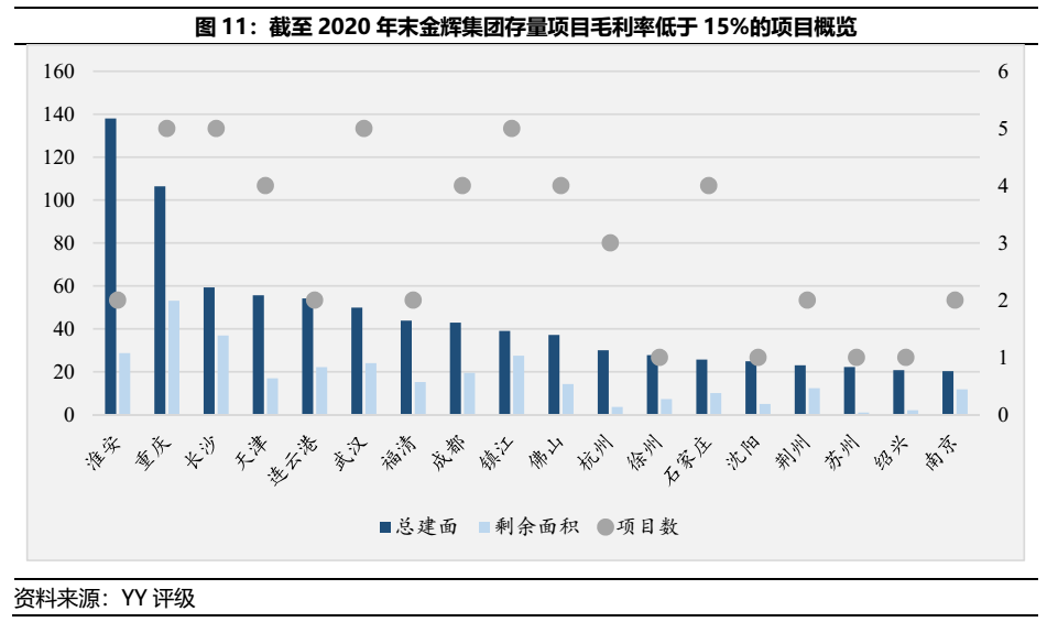 然而,根據(jù)存量項(xiàng)目區(qū)域分布進(jìn)行分析,金輝集團(tuán)所面臨的低毛利壓力或更勝于其他房企。其他房企所面臨的低毛利多出現(xiàn)于長(zhǎng)三角核心城市,其原因來(lái)自于競(jìng)爭(zhēng)房企過(guò)多所致的溢價(jià)。然而,金輝集團(tuán)低于15%毛利率的項(xiàng)目分布(如圖11)多位于重慶、長(zhǎng)沙、武漢、鎮(zhèn)江和石家莊等競(jìng)爭(zhēng)不如長(zhǎng)三角區(qū)域的城市,除了房住不炒造成的壓力外,金輝集團(tuán)或因投研判斷偏誤而給出較高溢價(jià)所造成的因素。
