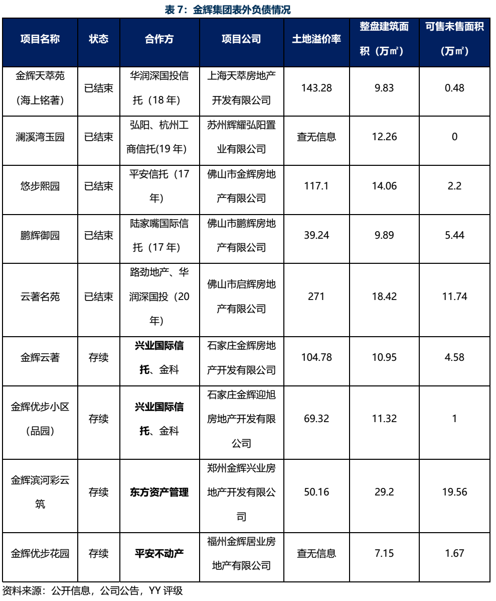 根據(jù)項(xiàng)目公司與樓盤(pán)名比對(duì)參考,羅列如表7的表外負(fù)債可見(jiàn),金輝集團(tuán)的存續(xù)表外負(fù)債情況較少,多為已結(jié)束的前融資金。然而,也可見(jiàn)個(gè)別的土地溢價(jià)率發(fā)現(xiàn),非標(biāo)資金多參與了高單價(jià)地塊的投資,因此后續(xù)仍需關(guān)注金輝集團(tuán)選擇的投資運(yùn)營(yíng)模式,跟蹤其招拍掛溢價(jià)情形,關(guān)注隨著高溢價(jià)拿地而來(lái)的表外負(fù)債。