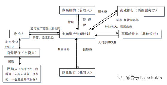 商業銀行理財資金或自有資金委托券商機構成立定向資產管理計劃,投資于銀行承兌匯票或商票,以到期承兌票款實現投資收益。這一業務設計主要是將票據資產從表內轉移到表外,擴大信貸規模。券商只是資管計劃的殼,銀行負責驗票和托收,已被127號文叫停。業務流程如下圖: