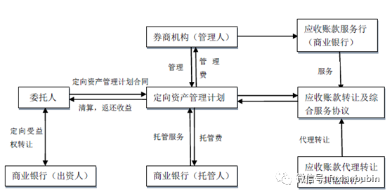 商業銀行理財資金或自有資金委托券商機構成立定向資產管理計劃,投資于應收賬款等具有穩定現金回報收益特征的資產。業務流程如下圖: