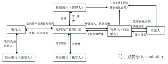 商業銀行理財資金或自有資金委托券商機構成立定向資產管理計劃,委托定向計劃通過委貸銀行或者信托計劃,將貸款發放給融資企業,業務調整存貸規模,實現調整資產結構的目的。業務流程如下圖: