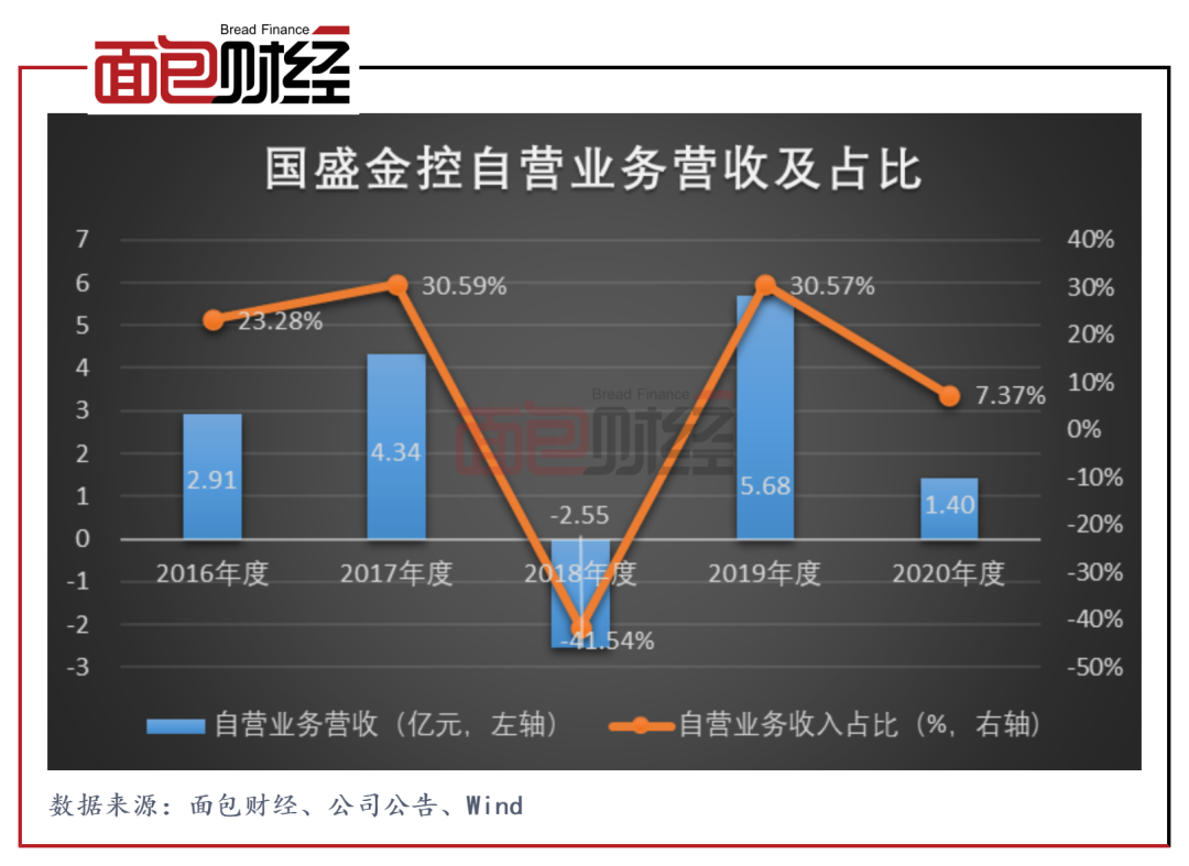 2020年,國(guó)盛金控的自營(yíng)業(yè)務(wù)規(guī)模大幅下降。公司稱報(bào)告期間,出于控制風(fēng)險(xiǎn)的考量,降低了自營(yíng)業(yè)務(wù)的規(guī)模。當(dāng)期公司證券自營(yíng)業(yè)務(wù)收入1.40億元,較2019年減少4.28億元,降幅達(dá)75.31%。主要受此影響,期末公司的交易性金融資產(chǎn)為56.06億元,較上年末下降44.77%。