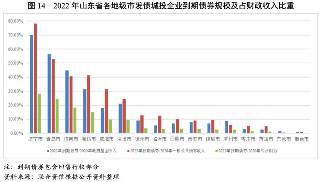 從城投企業2022年到期債券規模占2020年一般公共預算收入或政府性基金收入的比重來衡量一般公共預算收入或政府性基金收入對到期債券的覆蓋情況,償債壓力較大的城市為濟寧市、青島市、濟南市和濰坊市;以2020年綜合財力對城投企業2022年到期債券覆蓋程度來衡量2022年城投債券的到期償還壓力,2022年到期債券占2020年綜合財力比重較高的城市仍然為濟寧市、青島市、濟南市和濰坊市,占比分別為28.22%、24.18%、18.18%和16.72%??傮w看,濟寧市、青島市、濟南市、濰坊市和威海市城投企業到期債券的集中償付壓力較大。