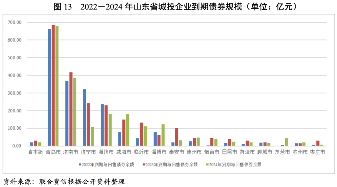 2020年以來,山東省大部分地級市發債城投企業債務負擔加重,整體流動性趨緊,償債壓力加大。各地級市發債城投企業債務償還仍主要依賴于外部籌資,各地級市融資狀況有一定差異。青島市和濟南市的城投企業未來三年到期債券規模大,其中濟寧市、青島市、濟南市和濰坊市的城投企業2022年到期債券集中償付壓力較大。