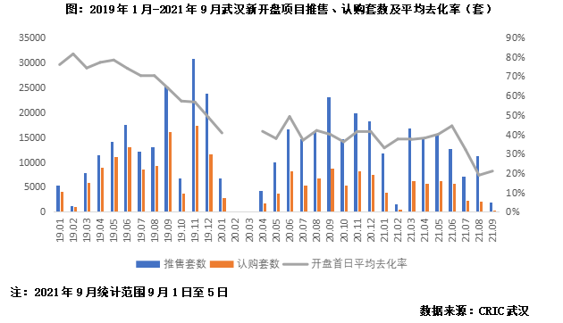 新開盤項目去化表現同樣反映武漢上、下半年市場冰火兩重天。上半年,武漢新開盤項目平均去化率基本保持在40%附近,6月平均去化率一度升至44%,創2020年以來單月新高。不過,8月打新市場顯著遇冷,平均去化率跌至19%,創近年來單月新低。9月初打新市場未見好轉跡象,前5日平均去化率仍保持在21%的低位。