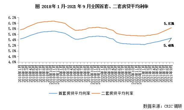 而從房貸利率層面,我們也不難看出端倪,受銀行信貸收緊影響,2月開始,全國房貸利率全面止跌回升,并趨勢性上移。據CRIC調研數據,2021年9月,全國首套房平均房貸利率5.46%,較2020年底上漲23BP,二套房貸款平均利率5.83%,較2020年底上漲29BP。