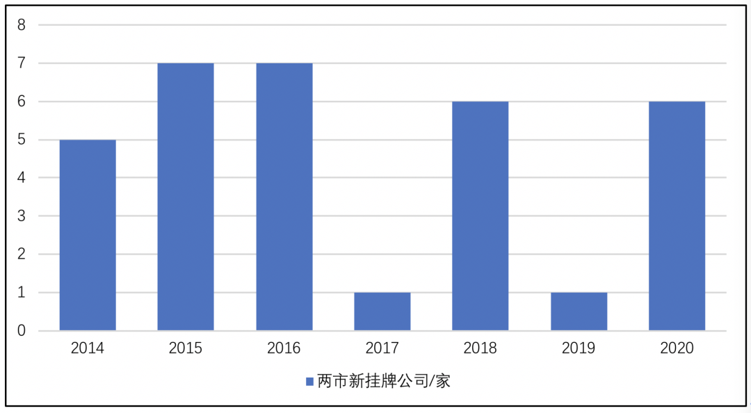 圖2 2014-2020年上交所、深交所優(yōu)先股市場新增上市公司數(shù)量