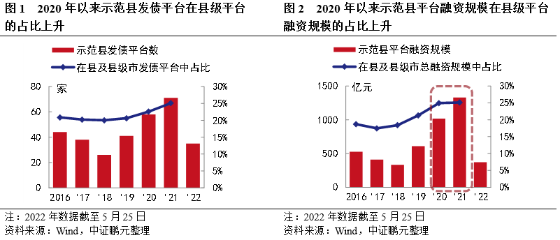 盡管《指引》審核的是項目,而非發債企業,但對縣及縣級市、特別是示范縣城投平臺發債的提振作用是不言而喻的。根據統計數據,2021年示范縣發債平臺數量和融資規模較2019年分別增長42%和118%。2022年5月,國務院發文,繼續加大縣城城鎮化建設的政策支持力度,并將政策提升至國家層面。可以預見,在未來縣一級特別是示范縣發債將會有更大突破。